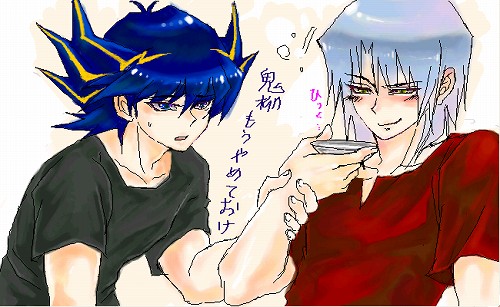 お酒をぐいぐい飲んじゃう鬼柳さんを止める遊星の図