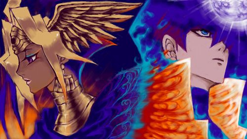 【金の翼をファラオの髪飾りに例えて。その圧倒的な存在感は誰もが惹きつけられる。翼だけど、空は飛べない偽りの翼、はるか昔にその生は終わっているファラオに未来を歩むことは許されない…。海馬の月の対象的なものとして遊戯は太陽。過去をみつめる遊戯の視線は下向きの構図。また、配下を見下ろす王の威厳の意も込めて。】